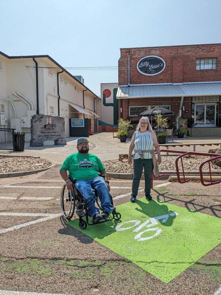 Before: Mobilize Waco board member Jimmy Moreno and organizer Meg Wallace, feeling frustrated because a rarely used and broken bike rack is in blocking a potential accessible parking space in front of Bitty & Beau’s which has many disabled employees and customers