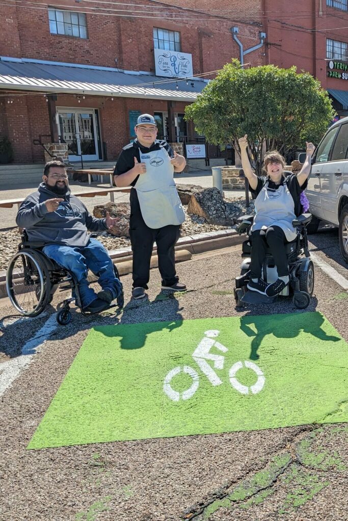 We had been in communication with the City of Waco about a broken bicycle rack that was blocking the way of what could be an accessible parking space in front of Bitty & Beau’s coffee shop at 110 Franklin in downtown Waco. We were pleasantly surprised on Monday morning, October 16, to see that the bike rack had been removed! Later, repainting and new signage made this into a much-needed parking space for Bitty & Beau’s employees and customers. Thanks, City of Waco!
